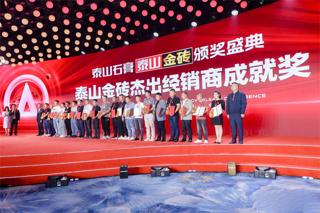 之后,10位工装商、10位家装商、10位设计师及10位媒体代表依次上台,分别从自身角度出发,向泰山石膏成功晋升全球领跑者致以深情贺词。更有泰山金砖颁奖环节,为泰山石膏的多方合作伙伴颁发“泰山金砖二十大杰出经销商成就奖”、“泰山金砖杰出经销商成就奖”、“泰山金砖杰出战略合作成就奖”、“泰山金砖杰出家装客户成就奖”、“泰山金砖杰出媒体合作成就奖”、“泰山金砖杰出顾问成就奖”、“泰山金砖品牌战略全案成就奖”荣誉大奖等奖项,和大家一同分享泰山石膏的荣耀时刻。