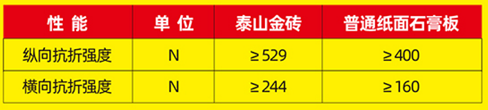 由于泰山金砖9项全能高端石膏板的板芯密实度高,且采用纯木浆高强黄金护面纸,高纯度石膏和增强纤维为主要原材料,通过独创胶凝硬板技术完美融合,造就了泰山金砖9项全能高端石膏板的超高强度。