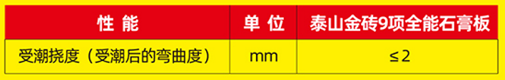泰山金砖9项全能高端石膏板经国家建筑材料工业装饰装修建筑材料质量监督检验测试中心检测,吸水率仅有8.9%,适合在厨房、卫生间、地下室等潮湿环境下使用。