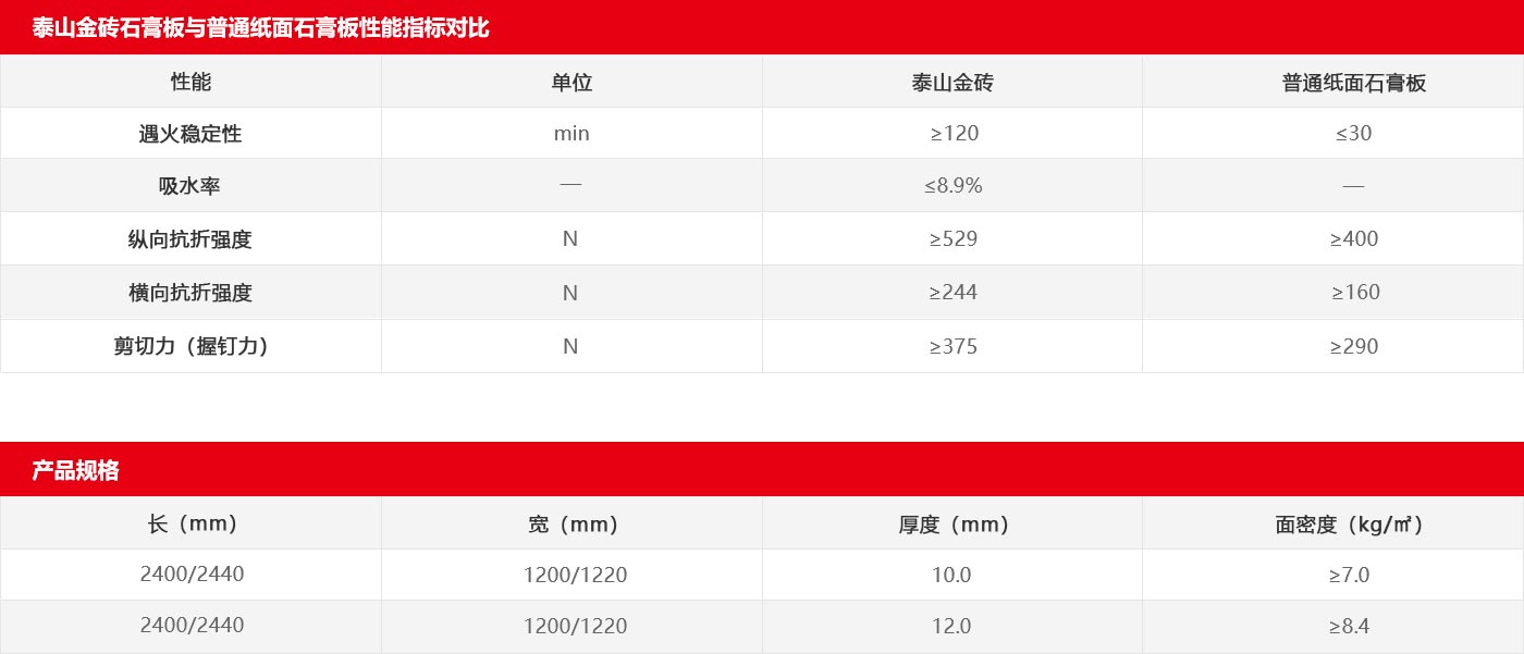 泰山金砖9项全能高端石膏板是一款高品质,多功能的高端石膏板。产品以高纯度石膏和纯木浆高强黄金护面纸为主要原材料,采用独创胶凝硬板技术,版心内添加高级耐火添加剂、耐火纤维和进口高级防水材料,产品在满足耐火性能要求的同时,提供了优秀的耐水和防潮性能,还具备高强度、抗冲击、抗变形、防开裂、密度高、隔音好、握钉强等优点,是高档装修的理想板材。